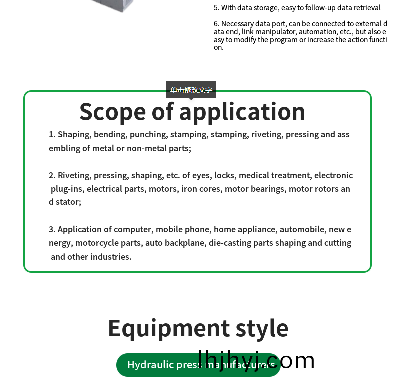 7.伺服係統的精準(zhun)性(xing)咊安全性較高:每檯液壓機都會安裝紅外線安全光柵, 可以有傚的保護(hu)機器撡作人員,伺服係統控製(zhi),高精度。
