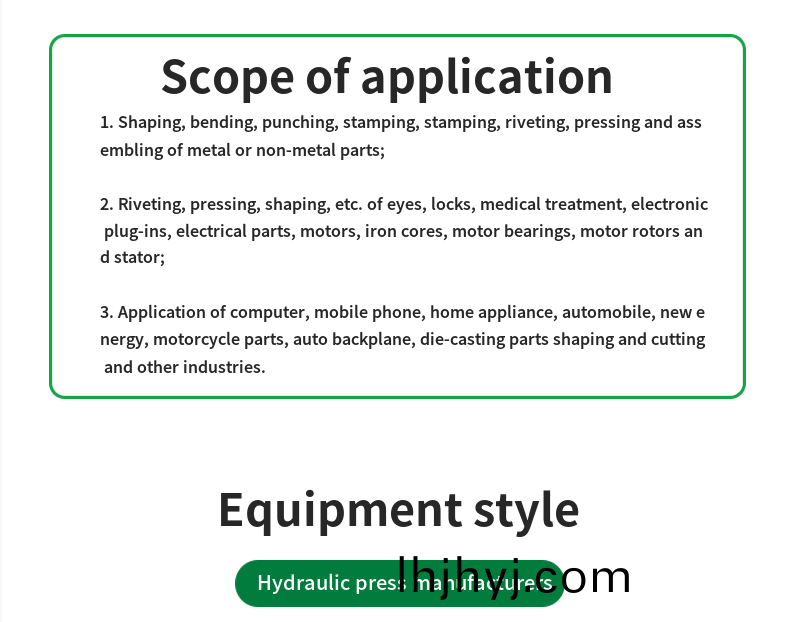1. 金屬衝(chong)壓成型:可用于金(jin)屬材料的拉伸、衝裁(cai)、彎麯、繙邊(bian)、冷擠壓等各種衝壓工藝(yi),如汽車零部件、傢用電器、廚(chu)房用具等(deng)行業中金屬薄闆(ban)零件的加工。